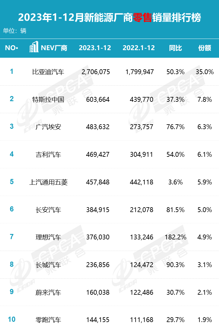 根据中国汽车流通协会乘用车市场信息联席分会(乘联分会)的数据,2023年,埃安销量不仅超过蔚小理,一度紧跟比亚迪和特斯拉,排行第三,力压一众大厂新能源。