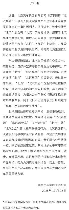 11月22日,北汽集团发声明,说收到了法院的一审判决书,告赢了一家搞不正当竞争的汽车企业。法院认定,该企业使用“北汽”及含有“北汽”字样的标识,损害了北汽集团的竞争利益,构成不正当竞争,依法判决其立即停止使用含有“北汽”字样的企业简称,并需公开登报声明以消除不良影响,同时向北汽集团支付经济损失赔偿及维权合理开支。