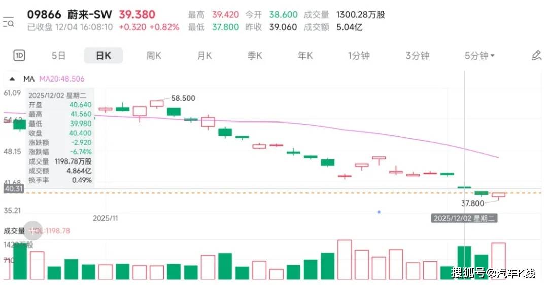 蔚来港股在12月2日大跌近7%,3日再跌3.32%,直到12月4日才终于止跌,收于39.28港元/股。