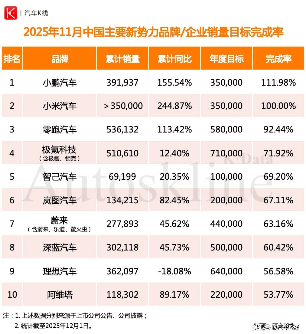 前11个月,仅三家新势力目标完成率超80%。