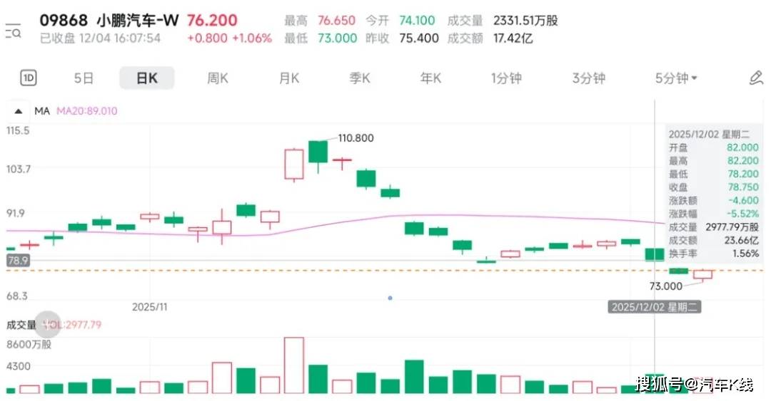 11月数据出炉后,多家上市新势力股价应声下跌。其中,12月2日小鹏汽车港股跌超5%,美股跌幅更是逼近8%,截至12月4日收盘,小鹏汽车港股报收76.2港元/股。