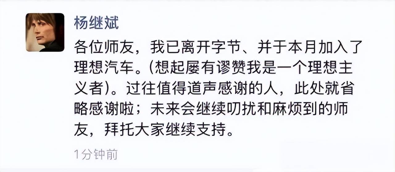 2025年底,前字节跳动公关总监杨继斌的一条朋友圈,在新能源汽车行业激起了层层涟漪。这位曾主导"头腾大战"、见证字节从创业公司成长为科技巨头的公关老兵,正式宣告加盟理想汽车。