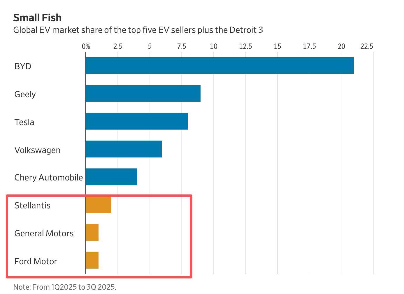 不过,他们还有很长的追赶之路。根据彭博新能源财经的数据,底特律三巨头在全球电动车市场的总份额不足5%。相比之下,电动车销量排名前三的企业比亚迪、吉利和特斯拉合计份额接近40%。